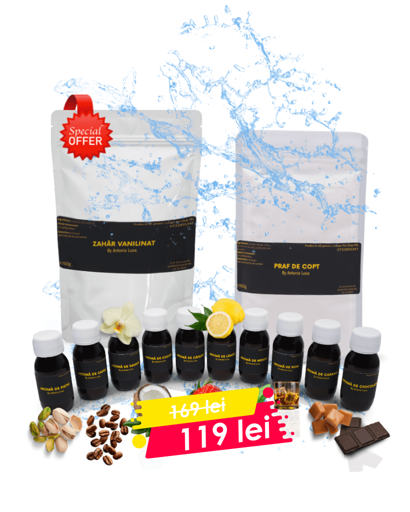 Descoperă o plăcere pentru fiecare simț cu pachetul nostru promoțional exclusiv! Aromele delicioase de cafea, căpșuni, caramel, ciocolată, cocos, fistic, lămâie, mentă, rom și vanilie te așteaptă să-ți încânte gusturile.